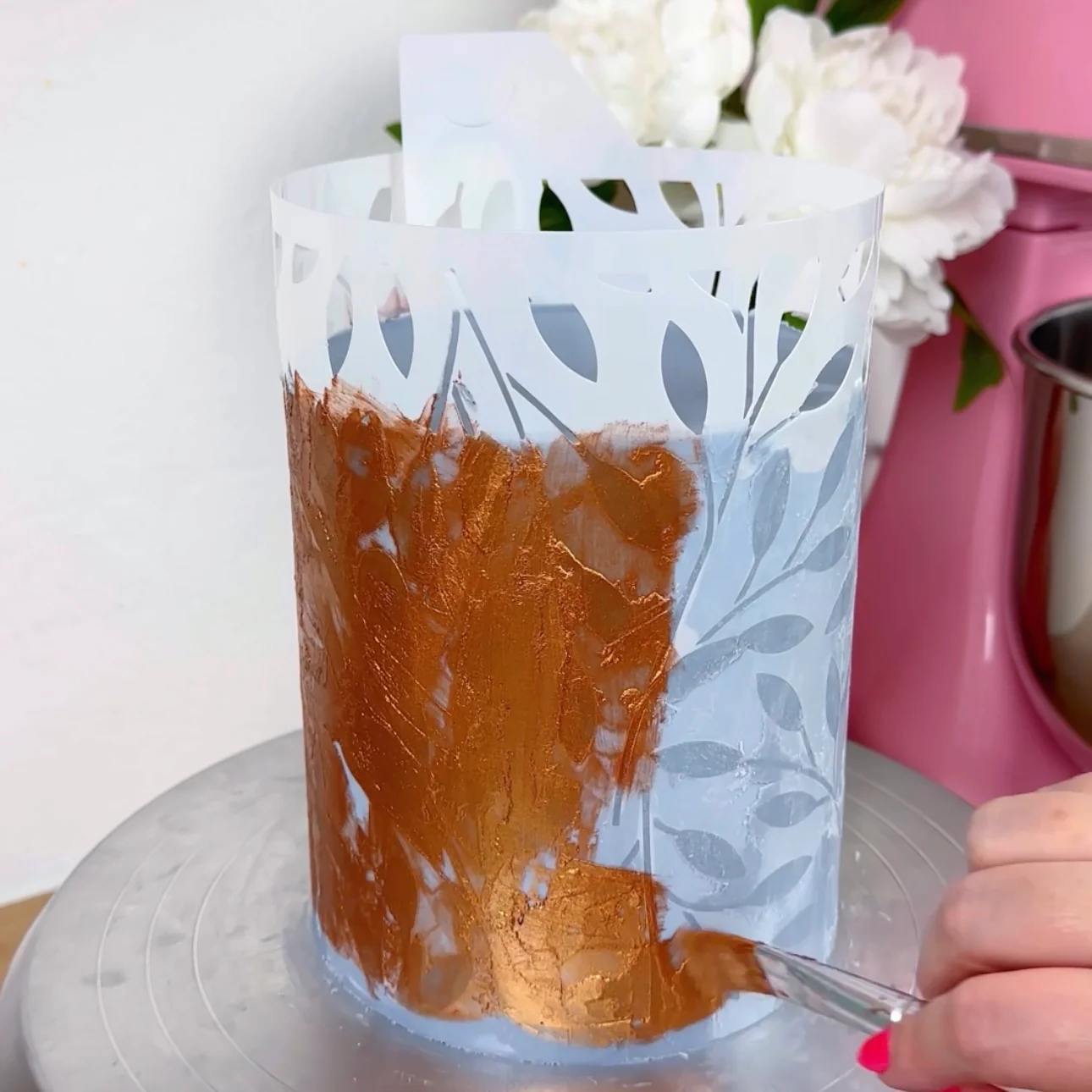 You can also use your Frost Form ™️ stencil to stencil your cakes as normal. The Extra Large Stencil wraps the whole way around your Perfectly straight cakes made using your Frost Form. This means you can stencil your cake in one go and no fuss with little to no room for error. YAY!